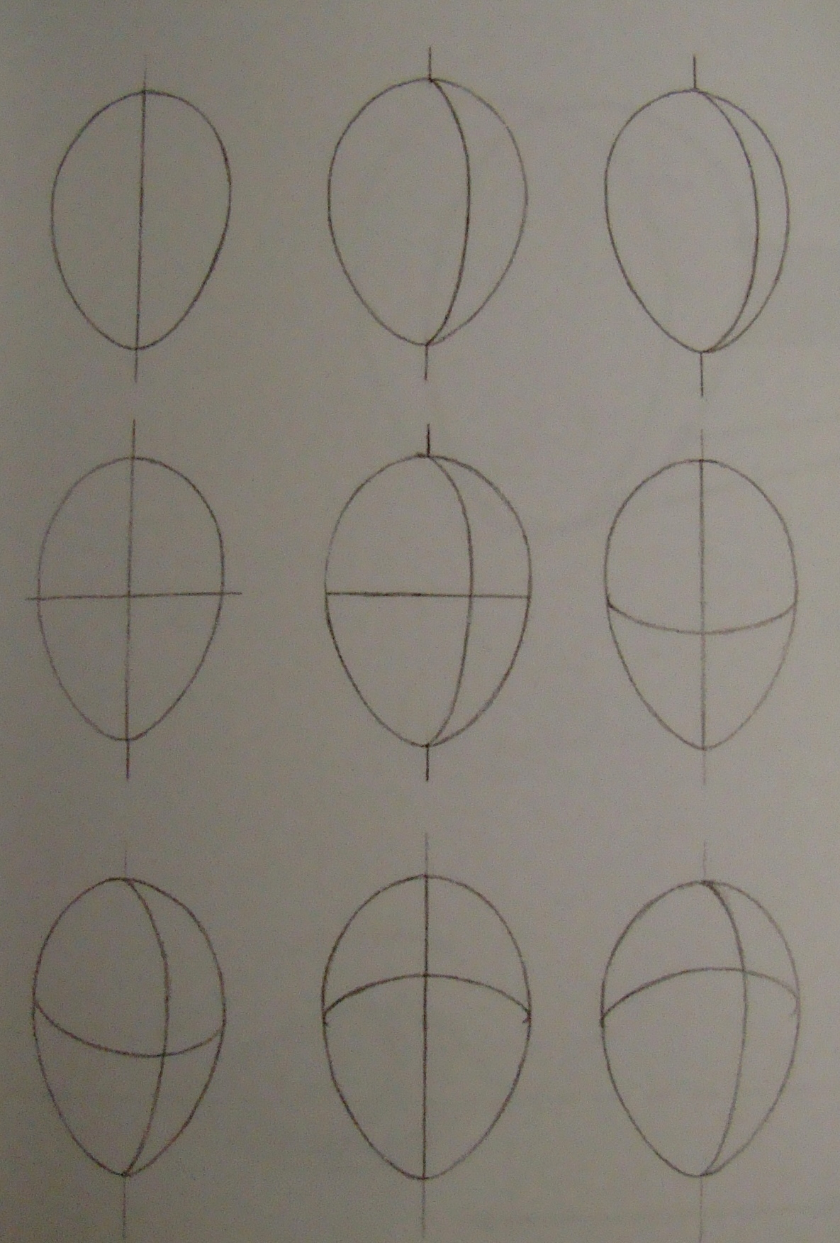 1. Ľudská hlava pripomína svojím tvarom vajíčko. Takže pri začatí kresby si naznač práve tento tvar. Konkrétne je to otočené vajíčko, s užším koncom smerom nadol.
