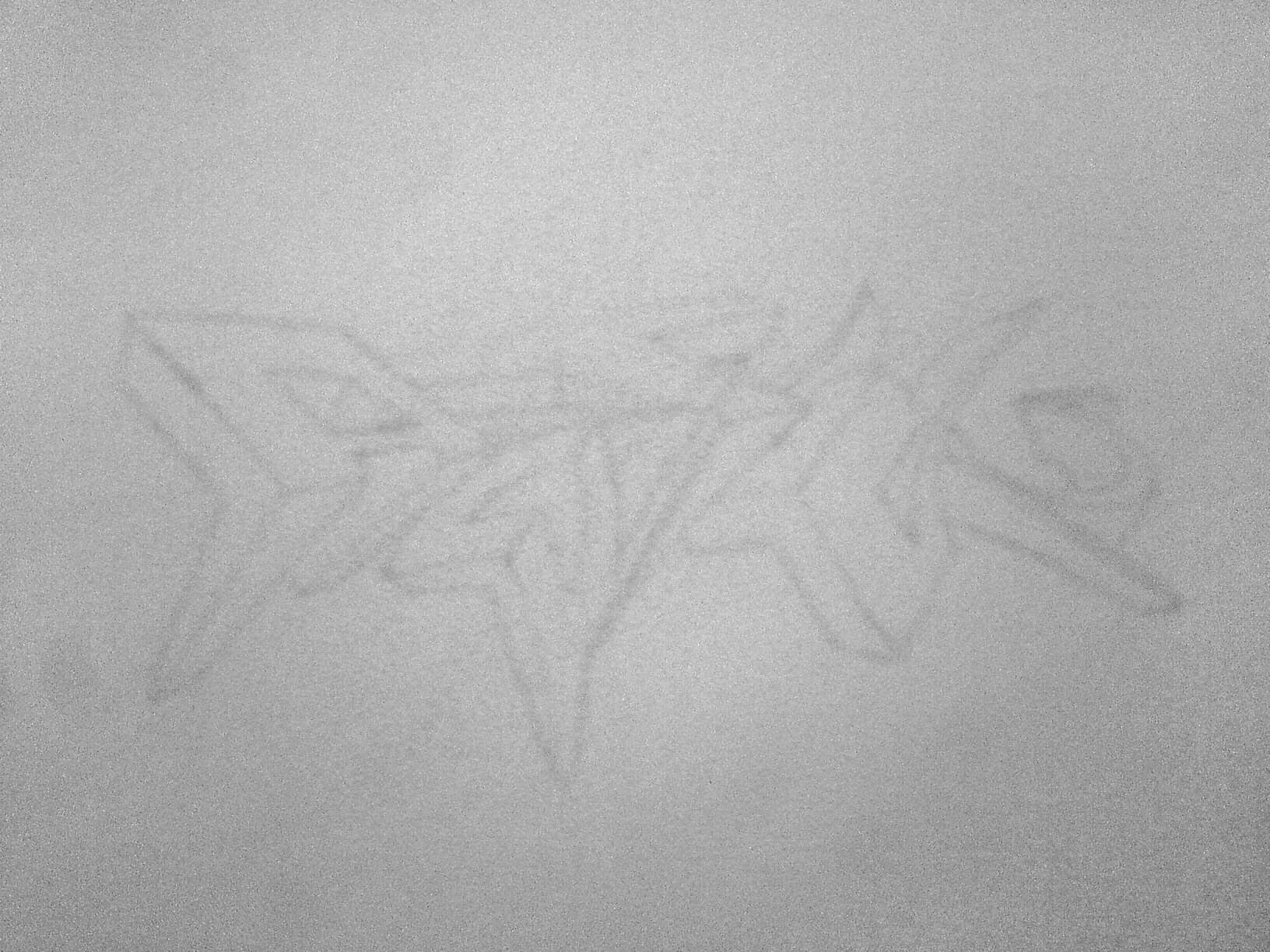 V mojom prípade a obrázku č.2 je slnko umiestnené v ľavom hornom rohu papiera. Čo znamená, že celé plochy odvrátené od tohto bodu budú najtmavším miestom na graffite. Takže všetky plochy v tomto smere treba zafarbiť na tmavú. Ja väčšinou používam na kresbu takýchto graffitov len ceruzky. Vtedy vyniknú tiene najlepšie. Začínam tvrdšou napríklad HB a končím pri 3B. Keď máte plochy zaplnené tmavou ako na obrázku č.2 pristúpi sa k ďalšiemu bodu. Plochy, ktoré sú obrátené k slnku čelom budú najsvetlejšie. Na nich nemusí byť skoro žiaden tieň. No ja kvôli reálnejšiemu výrazu graffitu ho tam dávam. Ale len zľahka a jemne. Plochy na písmenách, ktoré sú ako by bokom od slnka potrebujú tiene.