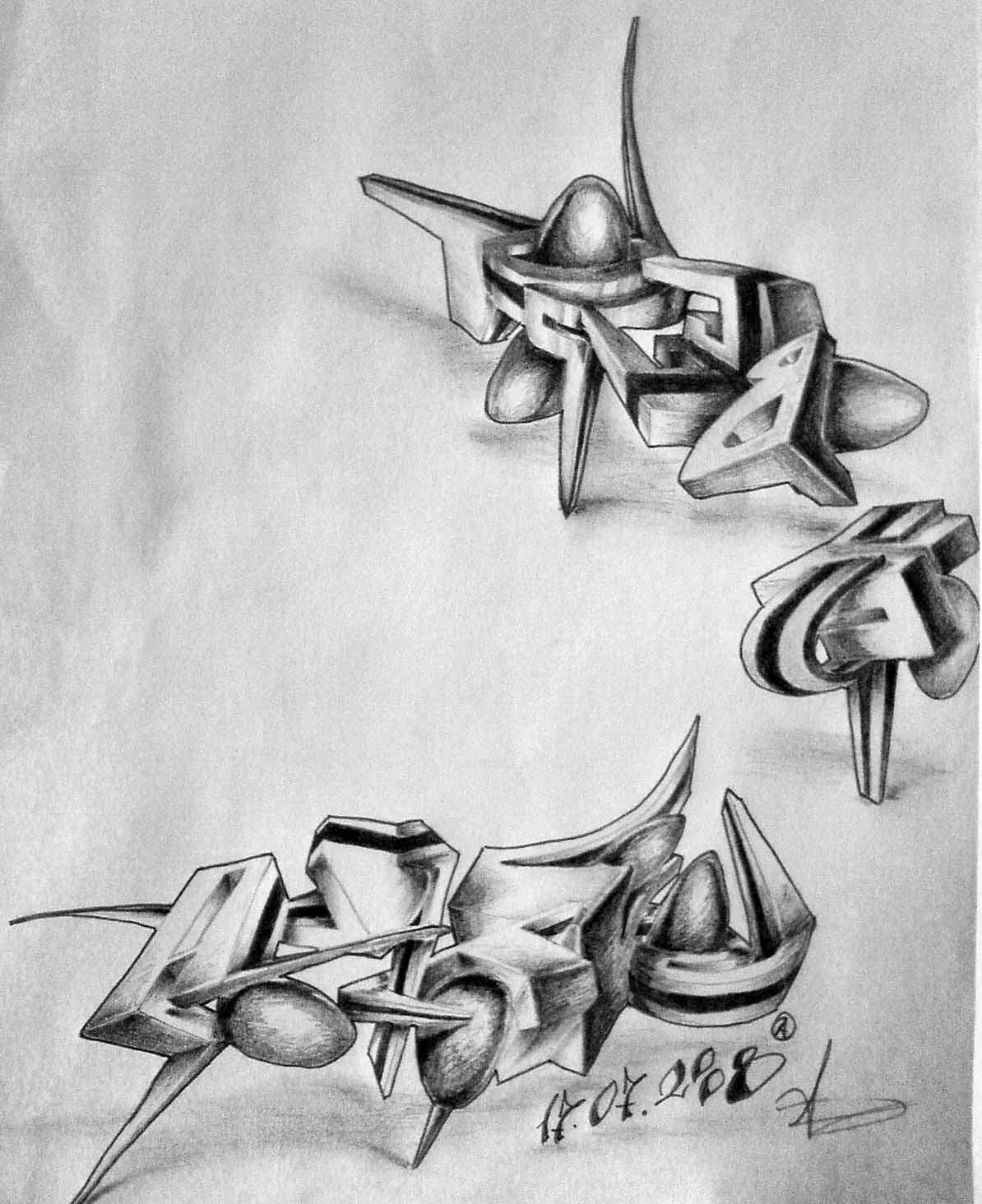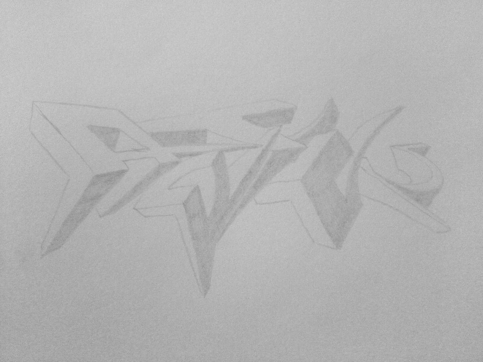 Na obrázku č.3 sú to tie otočené ako by vľavo. Tie miesta vytieňujte od určitého bodu, napr. zhora dole. Od najtmavších po najsvetlejšie. Je nutné spôsob tieňovania opakovať a robiť rovnako aby sa zachovala ako by realita písmen v priestore. Nech všetky vyzerajú rovnako. Z jedného druhu materiálu. Je dobré si predstaviť chróm alebo oceľ a jeho tiene. Keď sú plochy vytieňované a správne, celý graffit už začína mať svoju realistickú podobu. V tomto bode už máme hotové zhruba všetky základné tiene. Pridajú sa ešte jemné tiene na čelnú plochu. To aby graffit nevyzeral, že je bieleho materiálu. Potom sa tiene v najtmavších plochách zvýraznia. Vezmite si najmäkšiu ceruzku a smerom od vrchu nadol vytvorte tiene. Na vrchu pri lome písmena nech je najtmavší bod a smerom dole aby postupne bledol. Takýmto spôsobom môžete zvýrazniť aj tiene v bočných plochách, nech k sebe lepšie pasujú. Každé písmeno je tak trochu poprepletané s iným. A pri svite slnka vrhá na to druhé v určitých miestach tieň. Samozrejme ak sa nachádza v priestore nad ním. Na toto je treba mať skutočne realistickú predstavivosť a vnímanie svetla a tieňov. Tak ako je to v ďalšom obrázku.
