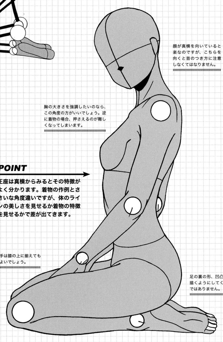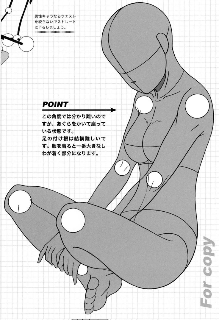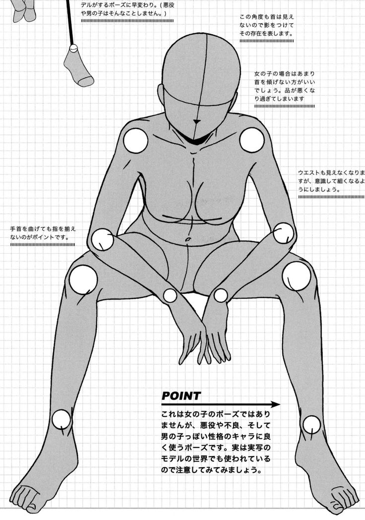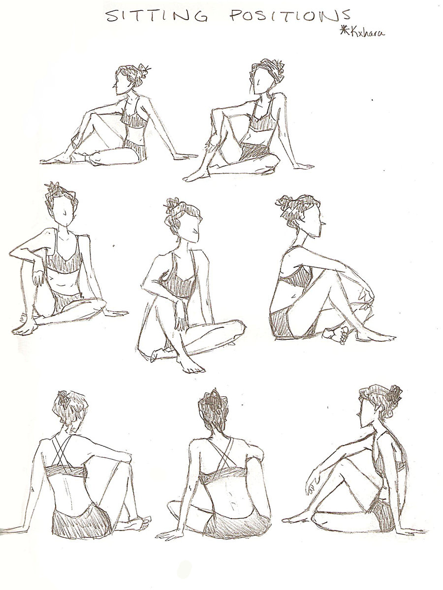 Kreslenie postavy v sede je trochu ťažšie ako kreslenie stojacej postavy. Základom je myslieť na polohu jednotlivých končatín a ich vytočenie. Keď kreslíte akúkoľvek figúru vždy si urobte najprv pomocné osi smerujúce od hlavy po boky a potom smer bokov a ramien. V končatinách naznačte ohyb v kolenách a lakťoch. Ak si toto všetko najskôr nahodíte, budete vedieť či sa vám postava celá zmestí do formátu a nebudete nemilo prekvapený výsledkom. Tiež je ľahšie upravovať celkový vzhľad kým je iba v jednoduchej skici a nieje ešte rozpracovaná.
