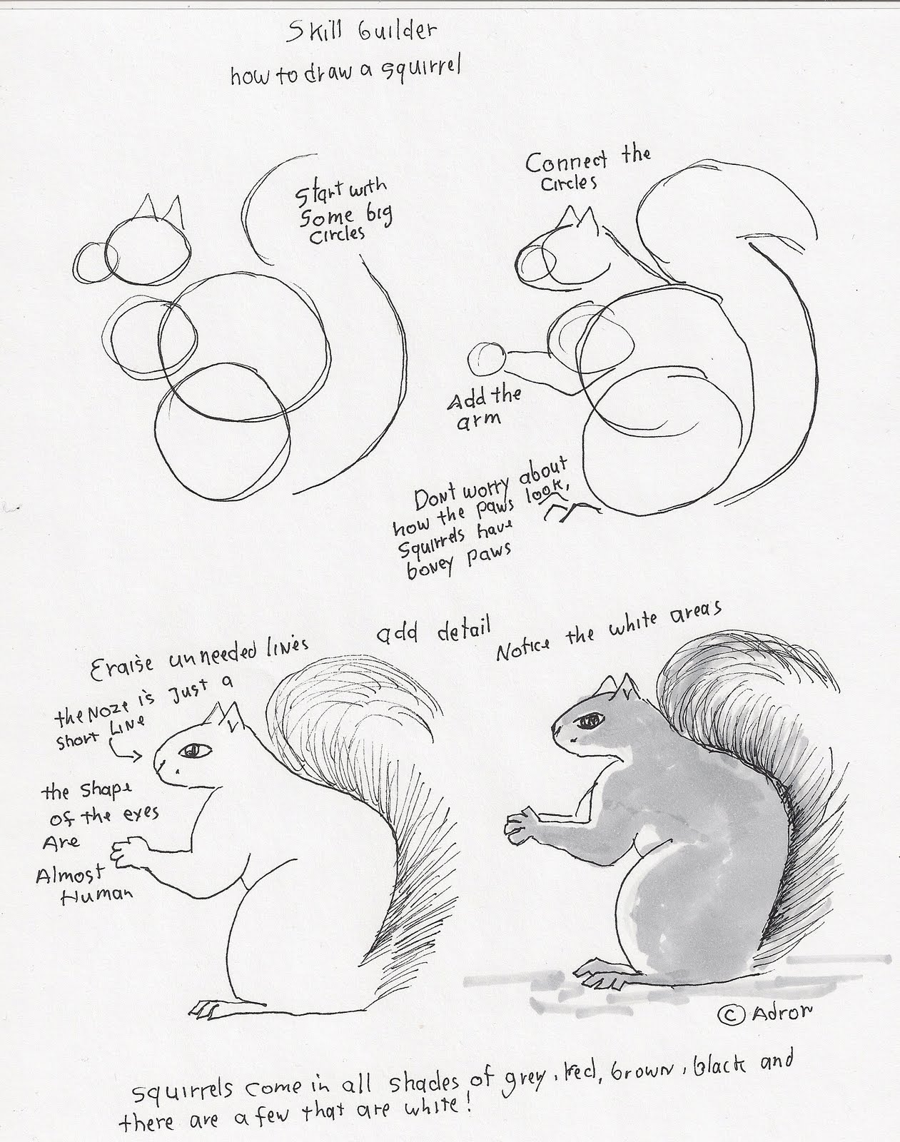 Takže, kreslenie veveričky je podobné ako postupovanie pri kresbe aj iných zvierat. Najskôr si naštuduješ jej kostrovú stavbu, ktorá ti pomôže pochopiť a predstaviť si veveričku v akejkoľvek polohe. Potom sa môžeš až pustiť do kreslenia.