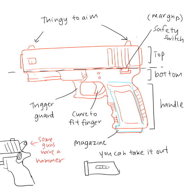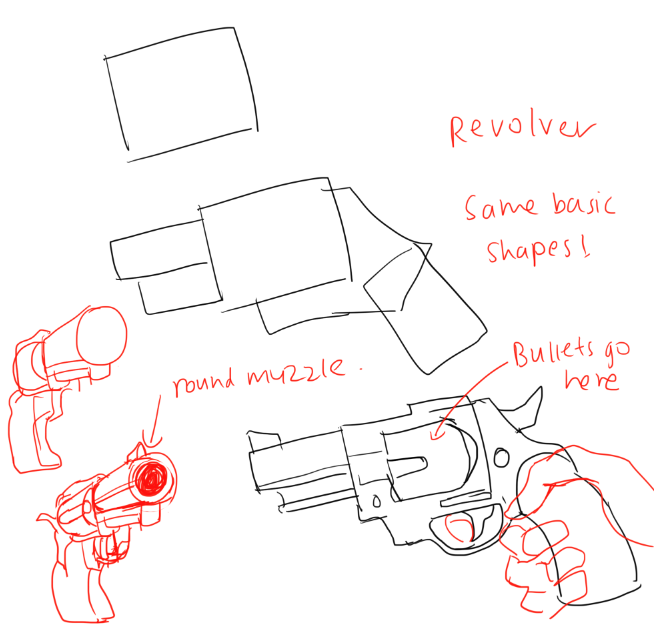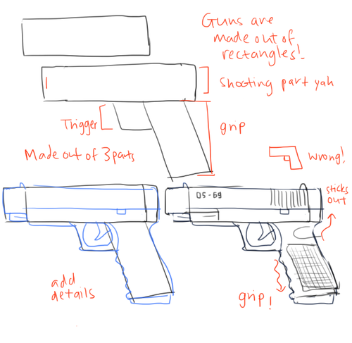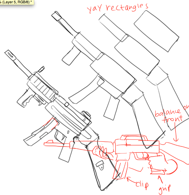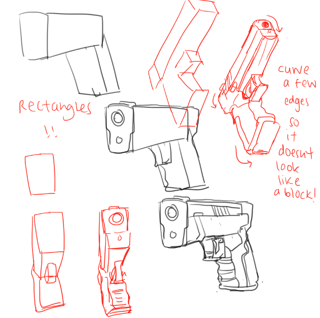 Zbraň je tvorená z 3. základných obdĺžnikových častí. Streliacia časť, spúšť a rúčka. Keď si naznačíš tieto 3 dieli, popridávaš ďalšie detaily.