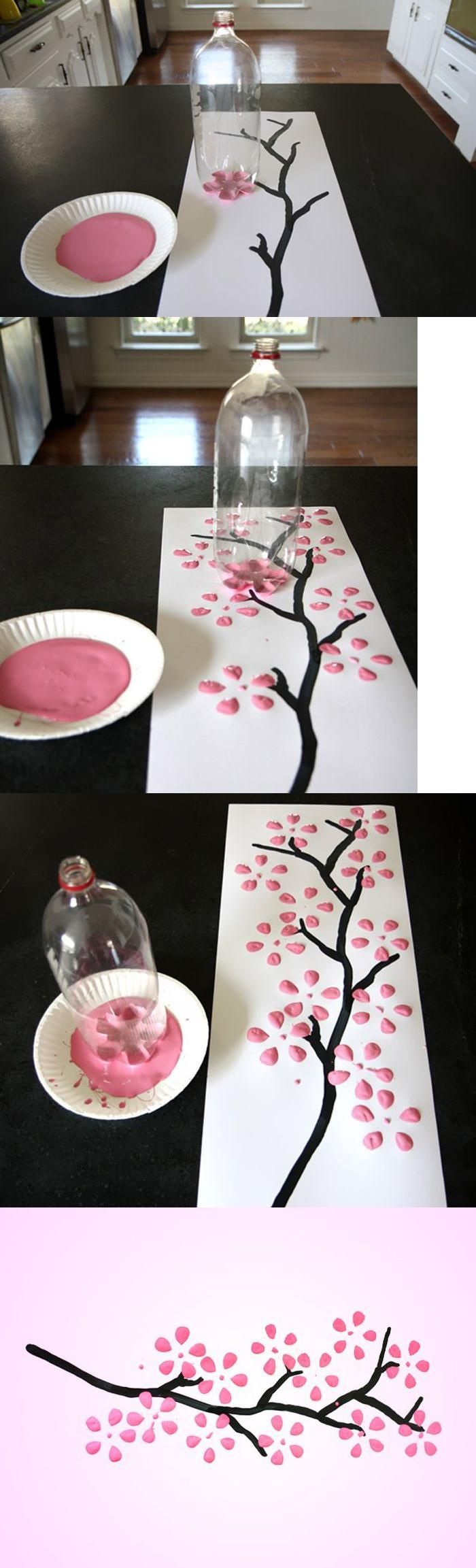 Strom vytvoríš vďaka plastovej fľaši. Presnejšie povedané, fľašou urobíš kvety na strome. Na začiatku si namaľuješ iba pár líniami vetvu stromu. Potom už len otlačíš hustejšiu farbu do ktorej namočíš spodok fľaše.