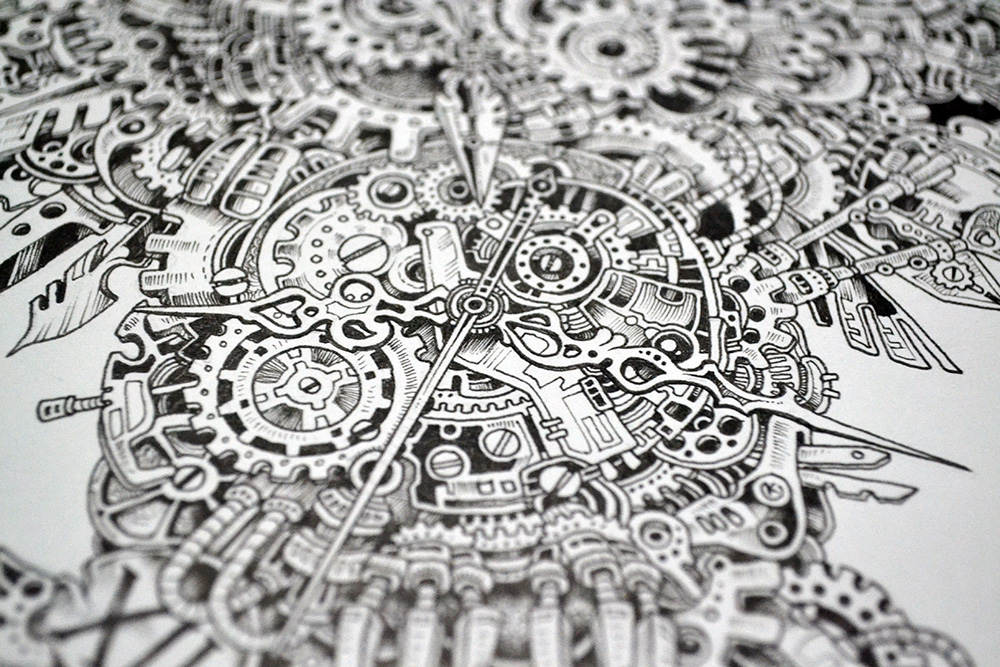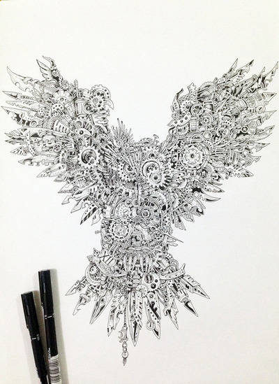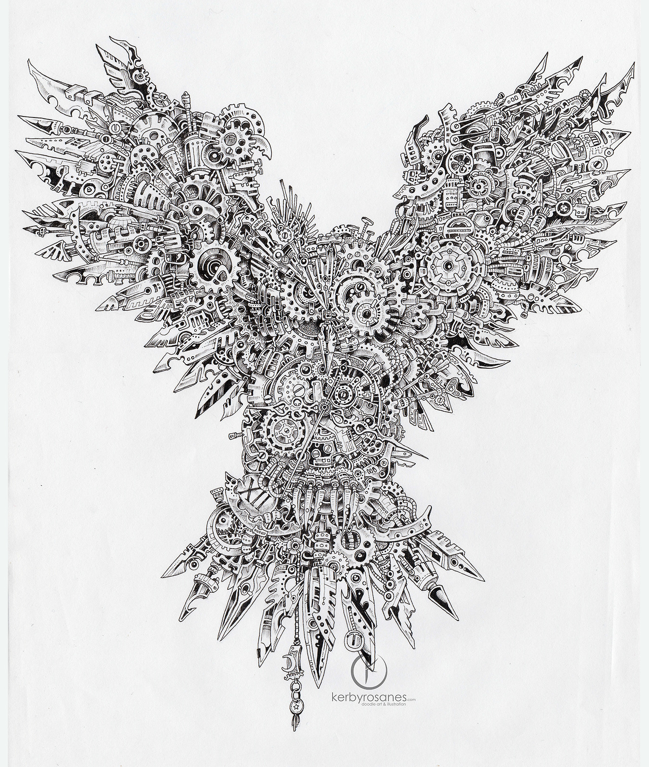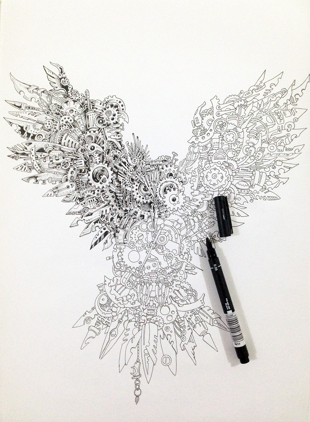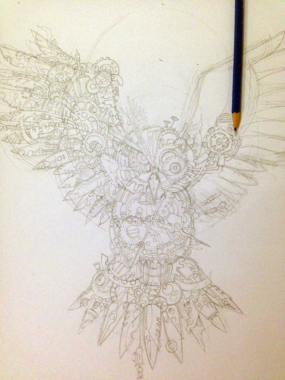 Túto kresbu sovy nazval „TIME GUARDIAN“ a ako môžeš vidieť je zložená z množstva mechanických súčiastok.