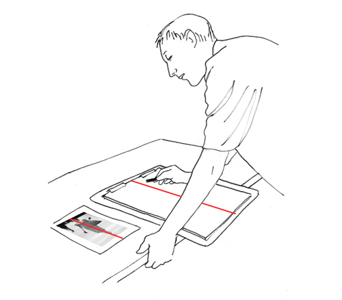 To sa týka aj odkreslovania predlohy – obrázku. Je lepšie keď si predlohu postavíš pred seba a na sklonenej ploche tvoríš. Je to komplikovanejšia, a je väčšia šanca že sa pomýliš keď to máš vo vodorovnej polohe. Na tento účel môžeš použiť akúkoľvek veľkú, tvrdú a rovnú podložku. Daj si záležať aby keď už tvoríš v správnom sklonení dosky aj predloha bola na dobrom mieste. Môžeš si ju zavesiť pred seba na stenu alebo oprieť o nejaký predmet. Keď už ale tvoríš vodorovne so stolom nechaj si na ňom papier aj predlohu. Postav sa potom ale k svojím kresbám, lebo potrebuješ mať dobrý nadhľad.